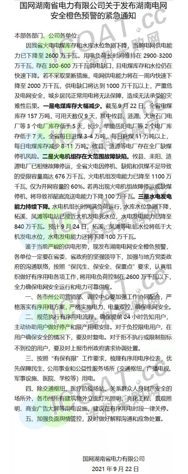 近日,安徽全省能源保供工作領導小組辦公室發布《關于做好有序用電的緊急通知》。其中提到,近期由于電煤持續緊張,省內機組異常頻繁等因素,全省將出現電力供需缺口,9月22日預計全省最大用電負荷3600萬千瓦,電力供需平衡存在約250萬千萬缺口,供需形勢十分緊張。為保障全省電網平穩運行和電力可靠供應,經研究,決定于9月22日起啟動全省有序用電方案。