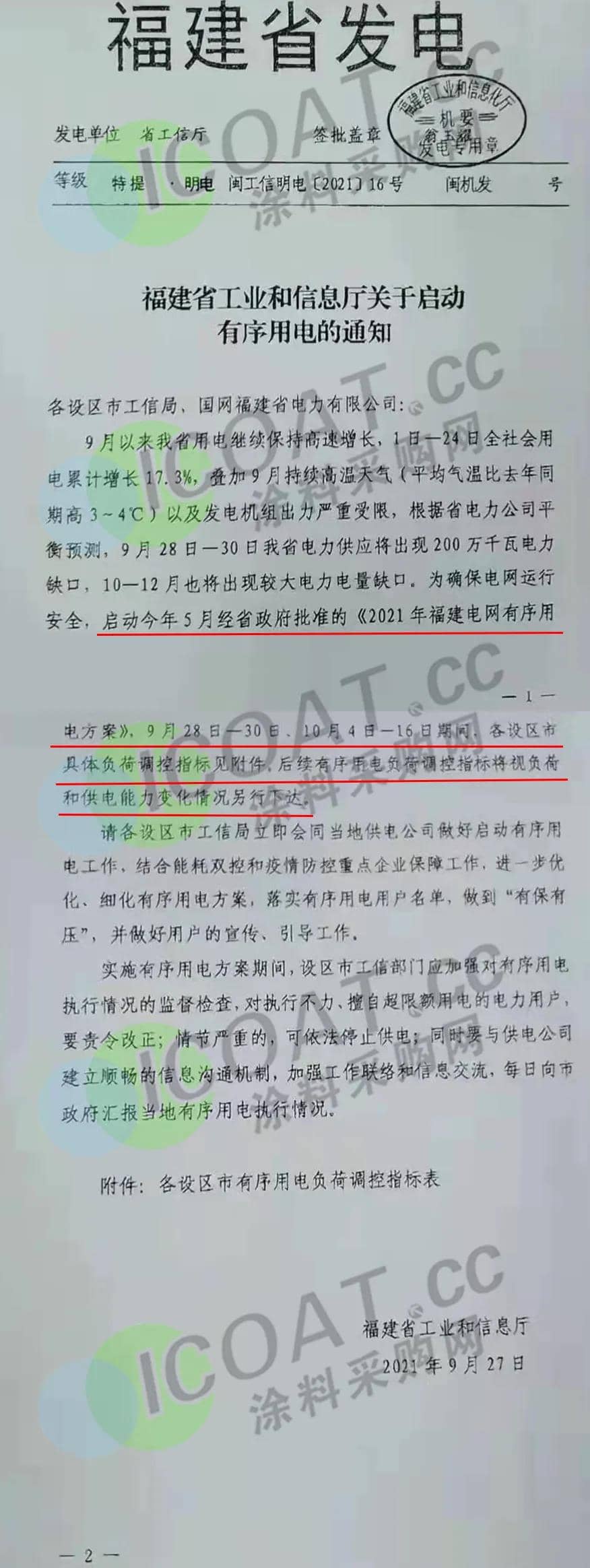 同日,福建省工信廳發(fā)布關(guān)于啟動有序用電的通知,稱9月28日至30日福建省電力供應(yīng)將出現(xiàn)200萬千瓦電力缺口,10-12月也將出現(xiàn)較大電力電量缺口,為確保電網(wǎng)運(yùn)行安全,啟動今年5月經(jīng)省政府批準(zhǔn)的《2021年福建電網(wǎng)有序用電方案》,9月28日-30日,10月4日至16日期間,各設(shè)區(qū)市具體負(fù)荷調(diào)控指標(biāo)見附件,后續(xù)有序用電負(fù)荷調(diào)控指標(biāo)將視負(fù)荷和供電能力變化情況另行下達(dá)。