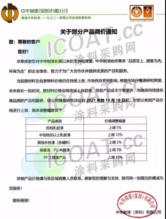 中華制漆(深圳)有限公司:10月18日起,低檔乳膠漆上調5%,中低檔及以上乳膠漆上調10%,其他水性漆(含輔料)上調5%,硝基漆、PU木器漆上調5%,FP工程漆產品上調10%。