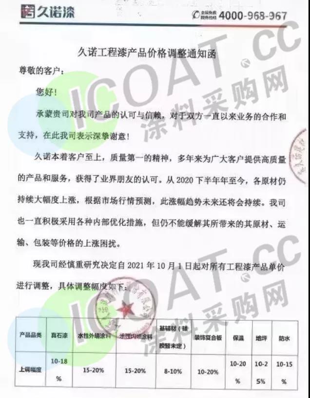 江蘇久諾建材:自2021年10月1日起對所有工程漆產品單價進行調整,其中: