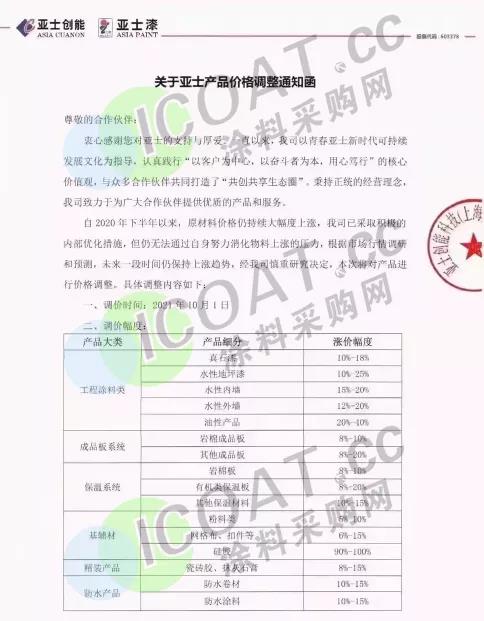 2、底漆、面漆、真石漆、質感漆、罩面漆類產品全線上調15-20%以上。