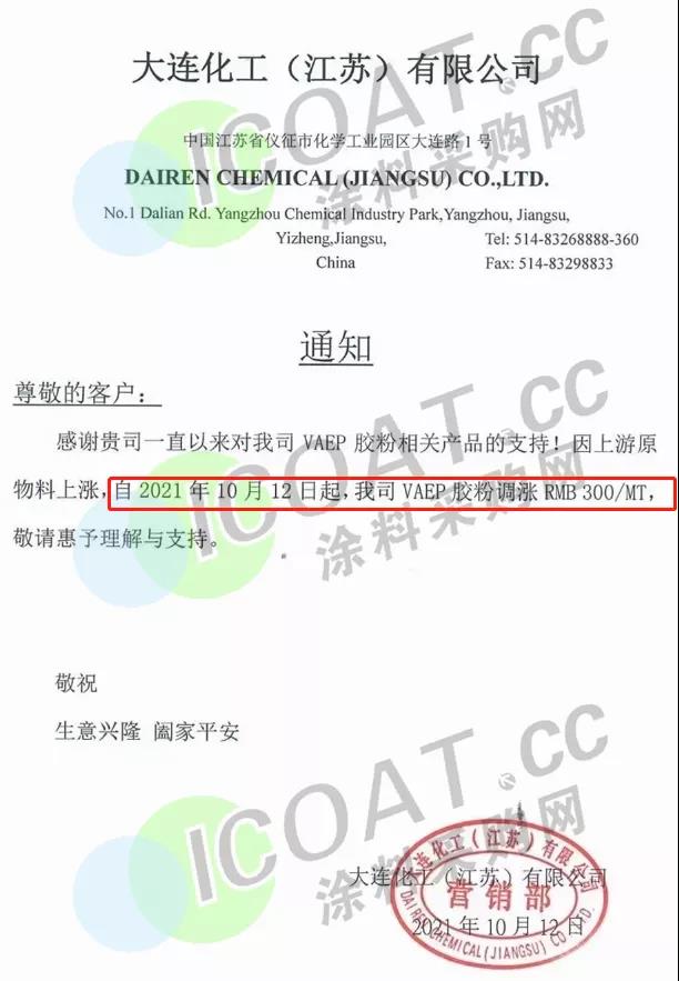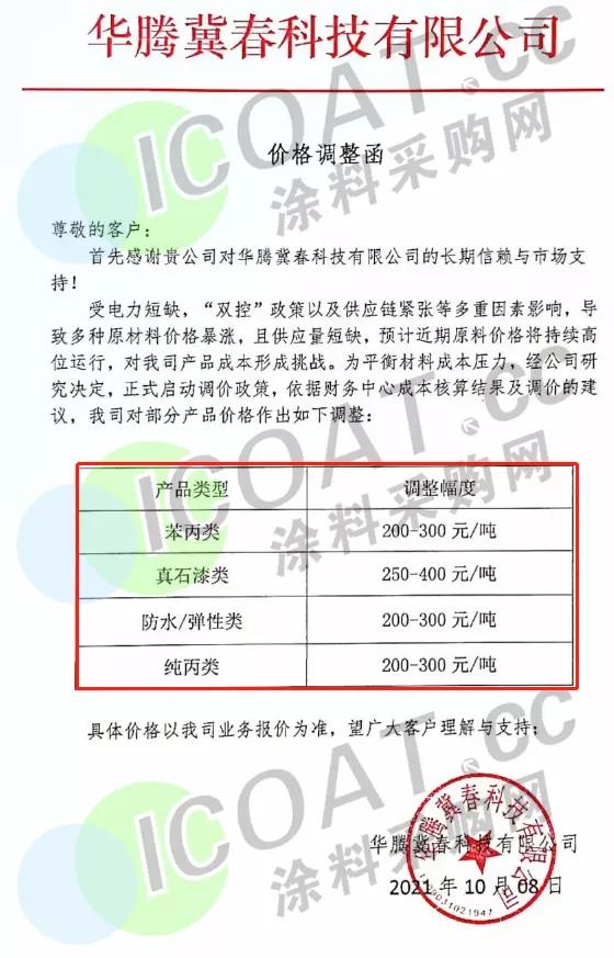 華騰冀春:對部分產品價格作出調整:苯丙類上調200-300元/噸,真石漆類上調250-400元/噸,防水/彈性類上調200-300元/噸,純丙類上調200-300元/噸。