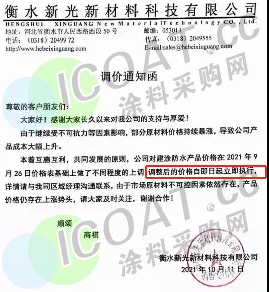 衡水新光新材料:對建涂防水產品價格在9月26日價格基礎上做了不同程度的上調,調整后的價格自11日起立即實行。