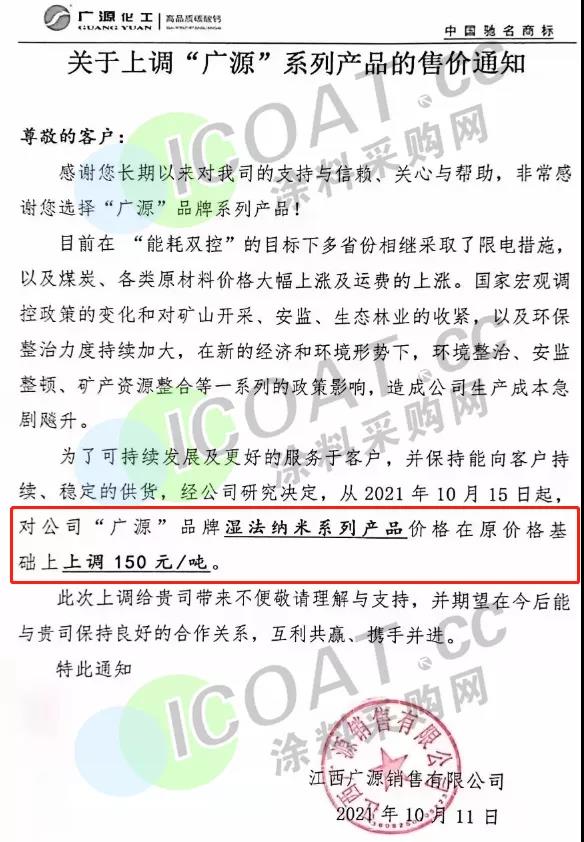 廣源化工:10月15日起,“廣源”品牌濕法納米系列產品在原價格基礎上上調150元/噸。