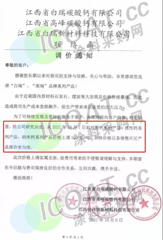 白瑞碳酸鈣:10月7日起對輕鈣系列產品、活性鈣系列產品、納米鈣系列產品價格上調100元/噸。