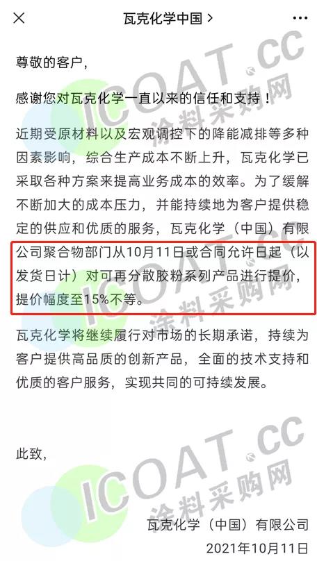 瓦克化學:11日起對可再分散膠粉系列產品進行提升,調漲幅度至15%不等。