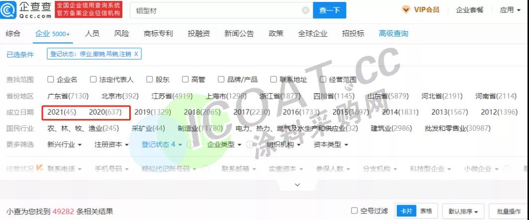 據公開資料,忠旺集團已成為了全球鋁業第二,年產能高達80萬噸,如今其經營困難也就意味著,鋁型材行業的發展遭遇重創。鋁價從去年的11000元/噸至今已經上漲了117%,創15年新高,下游鋁材毛利降低25%,多數鋁型材企業訂單減少了30%左右,生產線也出現了停產的情況。另外,恒大、華夏幸福等多家房地產龍頭企業爆雷,對于鋁型材行業需求減弱,也嚴重影響了鋁型材行業的行情。涂料采購網查閱相關數據得知,鋁型材行業近幾年注銷、吊銷、停業等非正常開業狀態企業已有近50000家,僅2020和2021年就有近1000家,整個鋁型材行業開始逐漸遇冷。