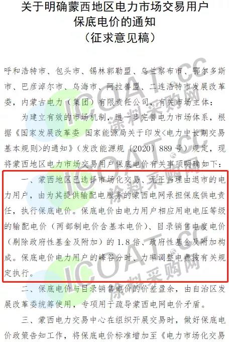 內蒙古發改委提出《關于明確蒙西地區電力市場交易用戶保底電價的通知》中的保底電價比原有電價上浮了80%。