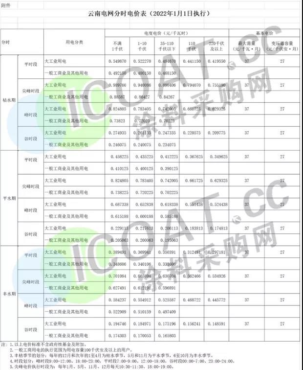 云南發改委發布公告《關于進一步完善分時電價機制的通知(征求意見稿)》。電度電價峰谷價差維持現行1.5:1:0.5,其中非市場化電量在目錄豐枯電價基礎上,峰時段電價在平時段基礎上上浮50%,谷時段在平時段電價下浮50%;市場交易電量以當月電能量交易價格為基準,峰時段電價上浮50%,谷時段電價下浮50%。