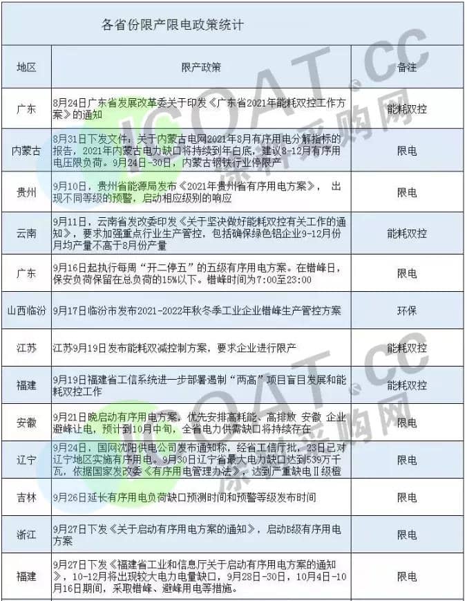 實際上,8、9月份就有部分地區出臺電價改革方案,例如貴州、廣東等省份先后發布通知,執行分時電價政策,在平段電價基礎上,上、下浮一定比例,形成高峰電價和低谷電價。目前限電最嚴的地區是河南,目前電爐已全部停產,長流程限產30%;長三角地區電力缺口仍有,但10月電爐廠并未大面積停產,以錯峰生產為主。以下是各省份限產限電的政策統計: