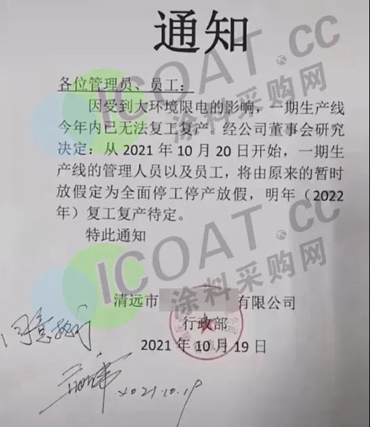 ?廣東清遠(yuǎn)某企業(yè)表示,因受到大環(huán)境限電的影響,一期生產(chǎn)線今年內(nèi)已無(wú)法復(fù)工復(fù)產(chǎn),經(jīng)研究決定,從2021年10月20日開(kāi)始,一期生產(chǎn)線的管理人員以及員工,將由原來(lái)的暫時(shí)放假定為全面停工放假,明年(2022年)復(fù)工復(fù)產(chǎn)待定。