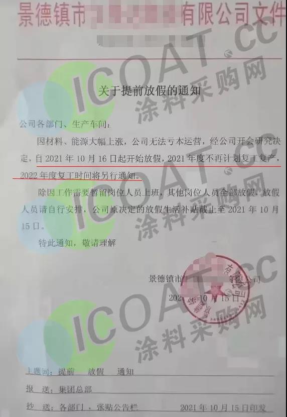 江西某企業(yè)表示,因材料、能源大幅上漲,企業(yè)無(wú)法虧本經(jīng)營(yíng),經(jīng)研究決定,自10月16日起開(kāi)始放假,2021年度不再計(jì)劃復(fù)產(chǎn)復(fù)工,2022年度復(fù)工時(shí)間將另行通知,原決定的放假生活補(bǔ)貼截止至2021年10月15日。
