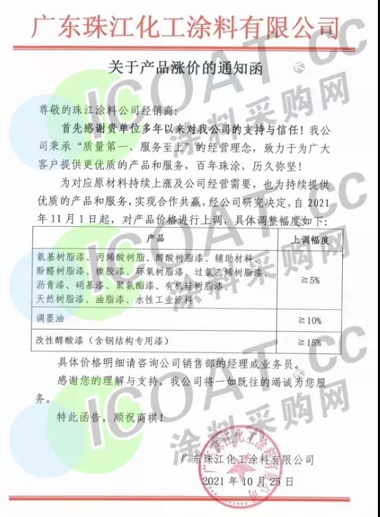 廣東珠江化工涂料:11月1日,氨基樹脂漆、丙烯酸樹脂、醇酸樹脂漆等產品上調幅度5%以上,調墨油上調10%以上,改性醇酸漆(含鋼結構專用漆)上漲15%以上。