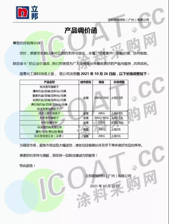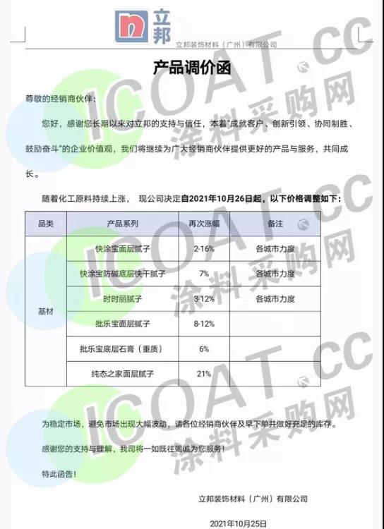 同時,立邦裝飾材料(廣州)有限公司發函表示,快涂寶面層膩子再次上調2-16%,快涂寶防堿底層快干膩子再次上調7%,時時樂膩子再次上調3-12%,批樂寶面層膩子再次上調8-12%,批樂寶底層石膏(重質)再次上調6%,純態之家面層膩子再次上調21%。
