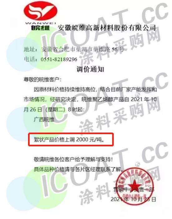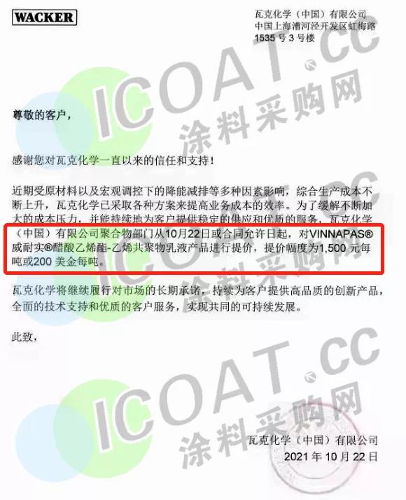 瓦克化學中國:10月22日起,對VINNAPAS®?威耐實®?醋酸乙烯酯-乙烯共聚物乳液產品進行提價,調漲1500元/噸或200美元/噸。