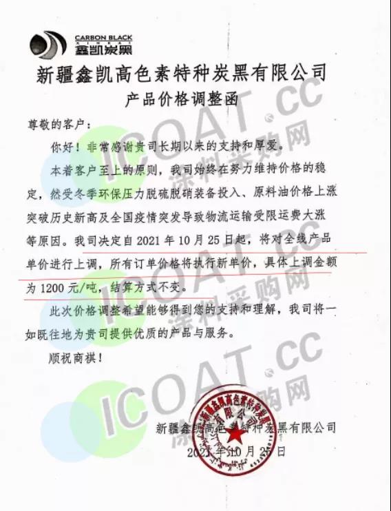 新疆鑫凱高色素特種炭黑:10月25日起,全線產品單價上調1200元/噸。