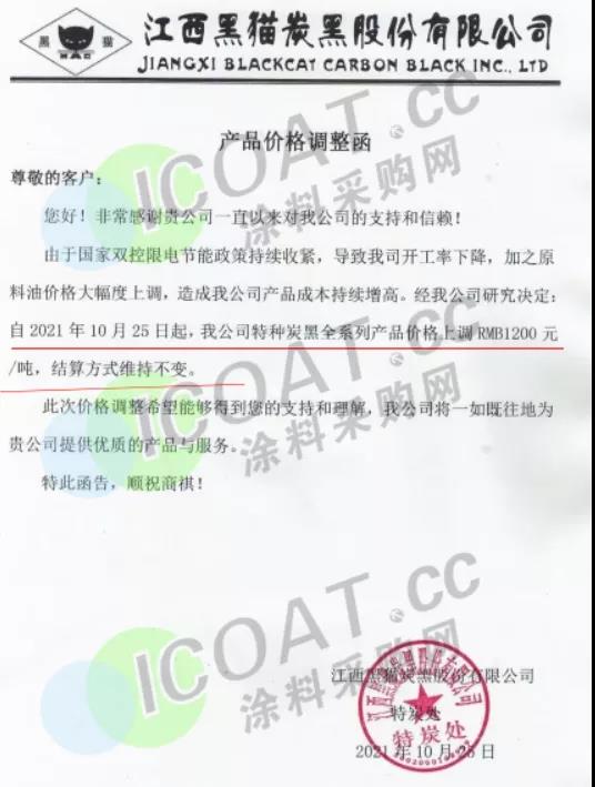 江西黑貓炭黑:10月25日起,特種炭黑產品價格上調1200元/噸。