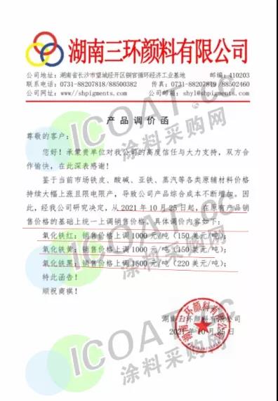 湖南三環顏料:10月25日起,在原有產品銷售價格的基礎上統一上調銷售價格。氧化鐵紅:銷售價格上調1000元/噸(150美元/噸);氧化鐵黃:銷售價格上調1000元/噸(150美元/噸);氧化鐵黑:銷售價格上調1500元/噸(220美元/噸)。