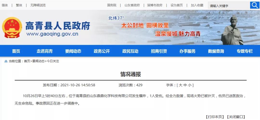 近日,山東淄博高青縣人民政府發(fā)布情況通報,10月26日早上5時40分左右,位于高青縣的山東鼎鼎化學科技有限公司發(fā)生爆炸,1人受傷。經(jīng)全力救援,現(xiàn)場火勢已被撲滅,傷員已送醫(yī)救治,無生命危險。事故原因正在進一步調(diào)查中。