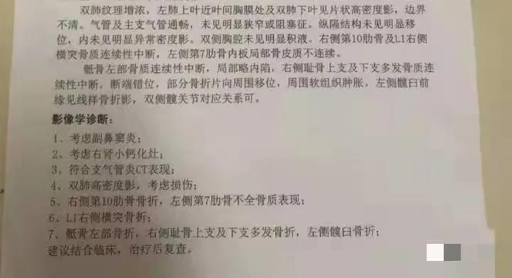 經鑒定,傷者右側第10肋骨骨折,L1L2右側橫突骨折,骶骨左部骨折,右側恥骨上支及下支多發骨折,左側髖臼骨折等近10處骨折,以及多處內臟損傷。目前仍躺在ICU病房,一只眼睛發現出血點,存在失明可能……