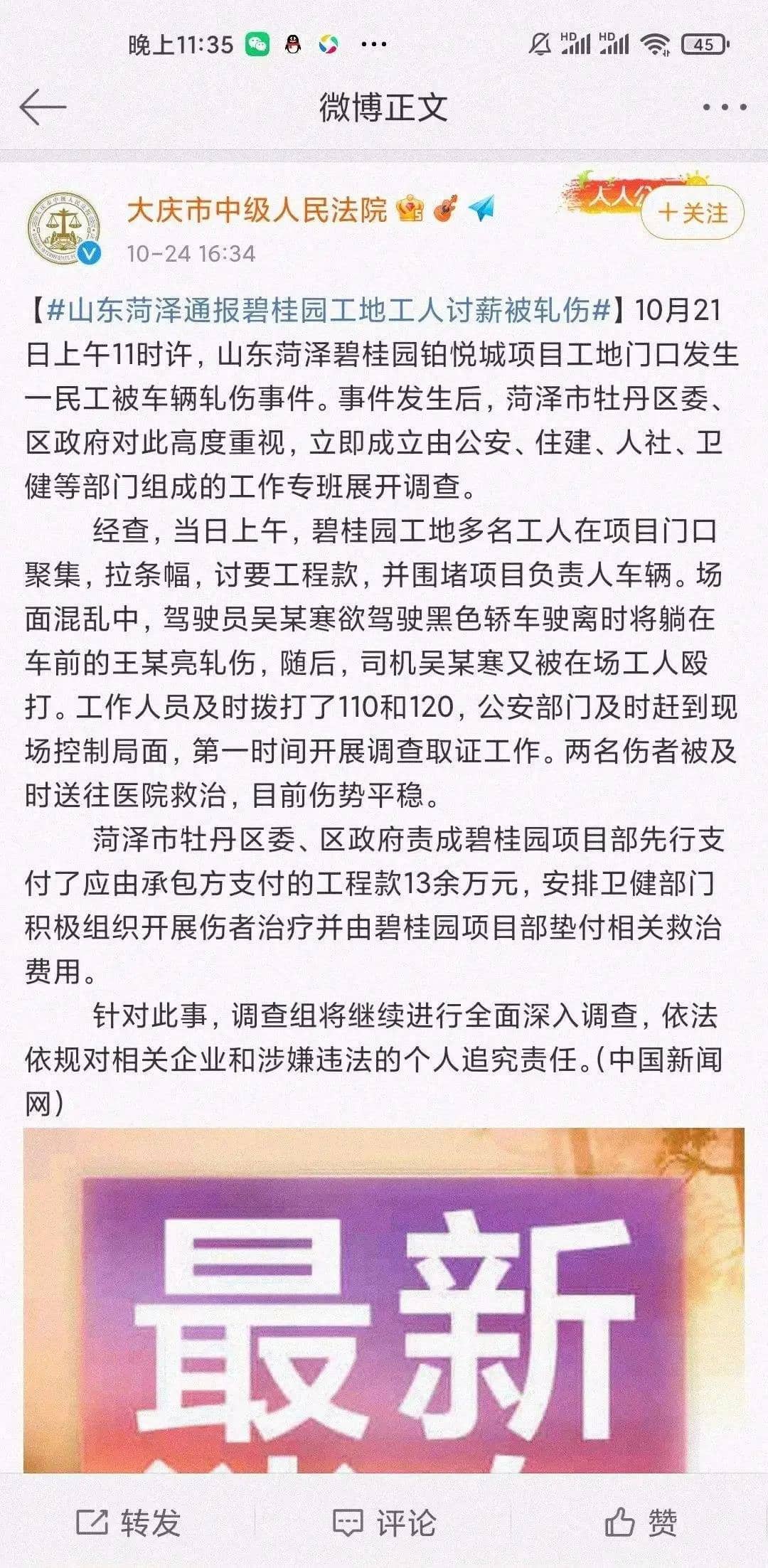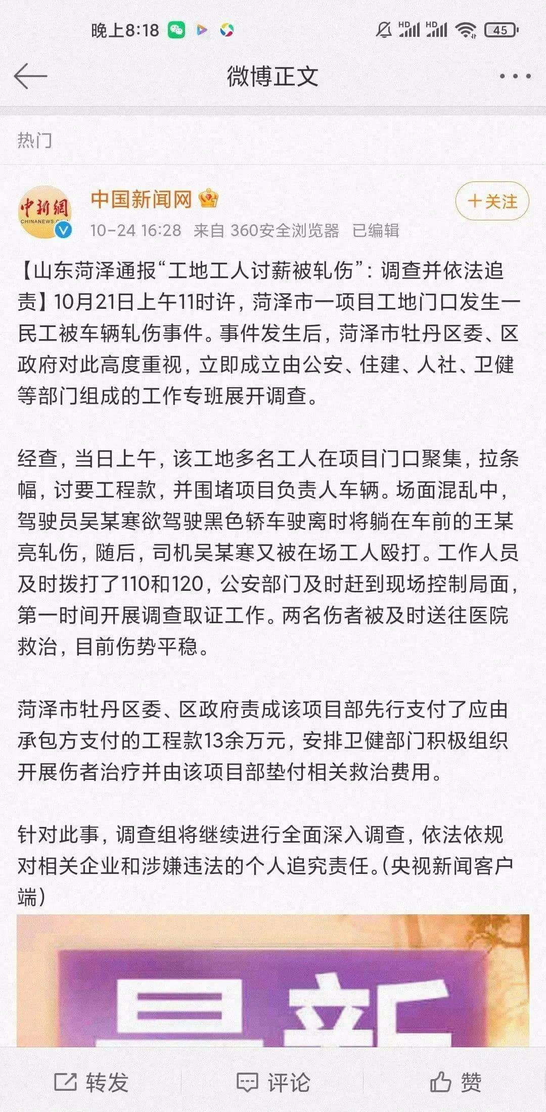 以下是官方通報:項目部先行支付13萬余元工程款。通報顯示:經查,當日上午,一工地多名工人在項目門口聚集,拉條幅,討要工程款,并圍堵項目負責人車輛。駕駛員吳某寒欲駕駛黑色轎車駛離時將躺在車前的王某亮軋傷,隨后,司機吳某寒又被在場工人毆打。公安部門第一時間開展調查取證工作,兩名傷者被及時送往醫院救治,目前傷勢平穩。