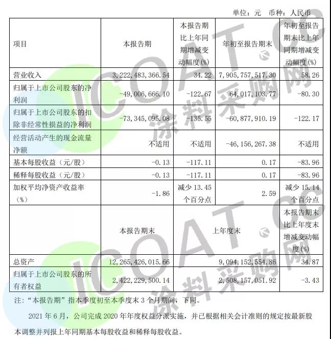 除了三棵樹外,汽車涂料龍頭金力泰的業績同樣不樂觀。2021年第三季度,金力泰實現營業收入1.84億元,同比下降28.63%;歸屬于上市公司股東的凈利潤為虧損4139.20萬元,同比下降182.37%。