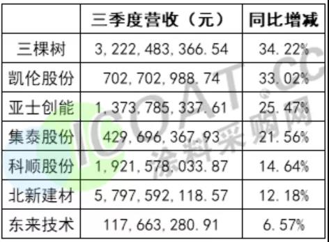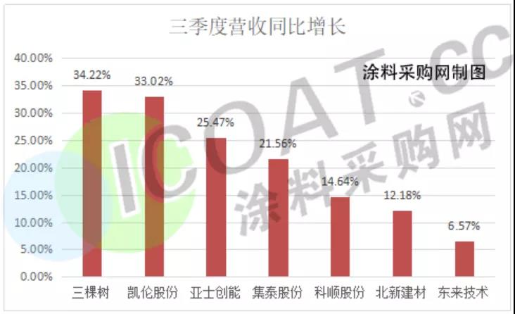 那么果真如涂料企業所說的,涂料行業已經“奄奄一息”了嗎?涂料采購網注意到,第三季度涂料企業的營收情況還是很可觀的。北新建材營收近60億,三棵樹、科順股份、亞士創能營收均超過10億,凱倫股份、集泰股份等營收超過1億元。