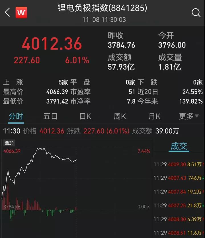 在億緯鋰能股價扶搖直上的同時,其余個股表現(xiàn)也不甘落后。中國寶安、璞泰來漲停,鋰電負極指數(shù)大漲近6%。