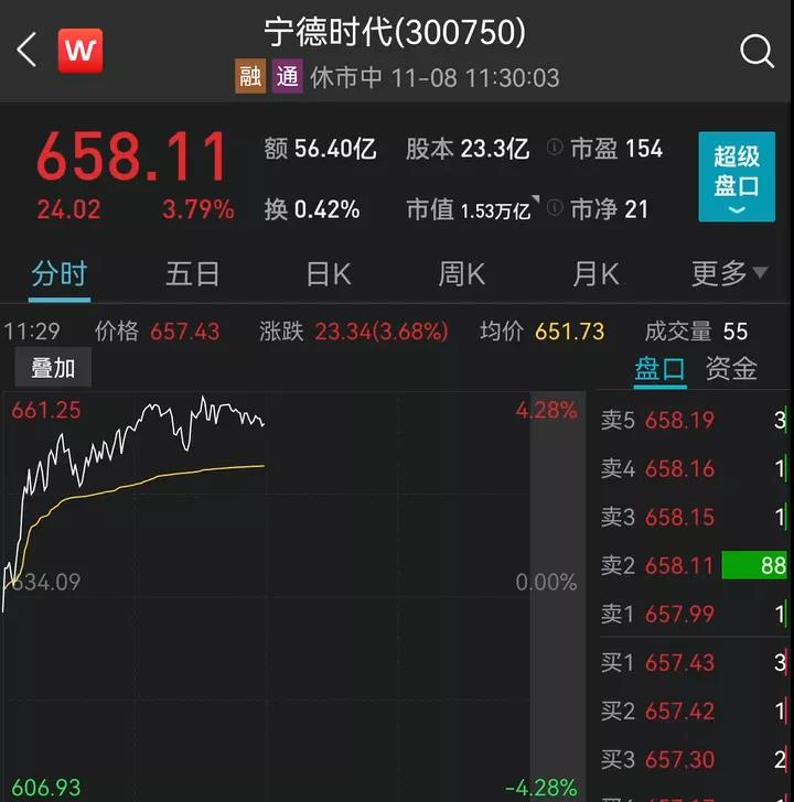 鋰電巨頭寧德時代也高開高走,收漲3.79%,最新股價658.11元,市值1.53萬億元。