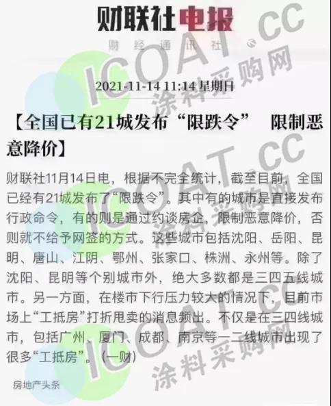 ?2021年即將迎來尾聲,在“維穩”信號持續釋放,“限跌令”快速鋪開的形勢下,樓市已經出現“暖陽”,涂料行業也似乎看到了久違的曙光。而這樣的利好能否持續,讓房地產產業鏈的涂料、化工等行業度過“至暗時刻”,涂料行業又能否再次迎來火爆的訂單潮,值得我們拭目以待。