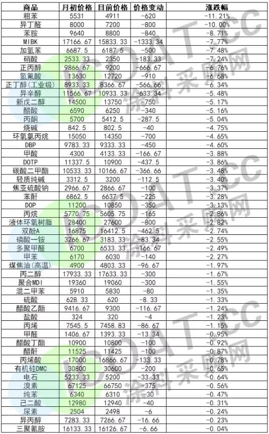 此前涂料采購網曾報道,“金九銀十”旺季之后,眾多化工品價格開始陸續下滑,且有愈演愈烈之勢。而今已經邁入2021年最后一個月,化工品的跌勢仍沒有停歇的意思,12月月初至今不到一周的時間里,幾十種化工品價格走低。