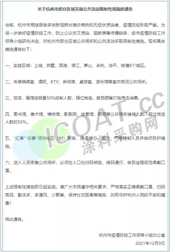經市疫情防控工作領導小組研究決定,對杭州市部分區域公共場所和公共活動采取限制性措施。上城、拱墅、西湖、濱江、蕭山、余杭、臨平、錢塘8個城區,關停棋牌室、酒吧、KTV、麻將房、桌游室、游泳館等室內密閉公共場所等。