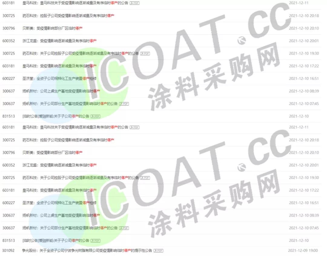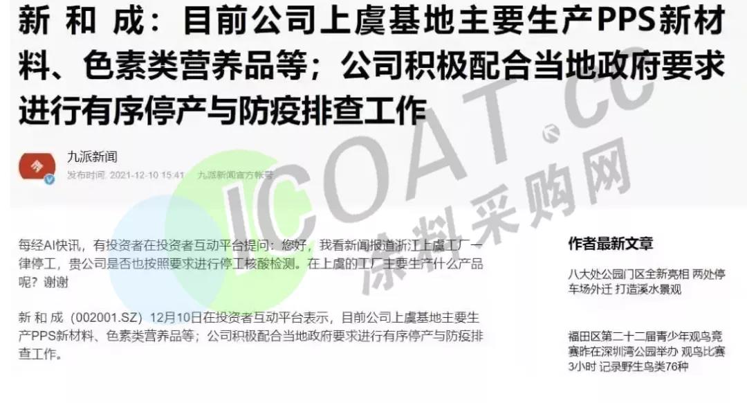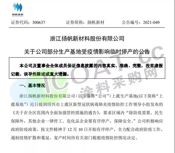 揚帆新材:于12月10日開始有序停產,復產時間待有關部門根據疫情防控情況決定,上虞基地主要生產部分光引發劑產品。臨時停產對公司2021年總體業績影響相對有限。