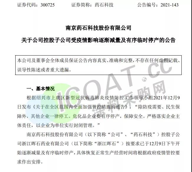 藥石科技:公司控股子公司浙江暉石藥業有限公司按要求已于12月9日下午開始逐漸減量及有序臨時停產,具體恢復正常生產經營時間將根據政府疫情管控要求作出安排。預計本次逐漸減量及有序臨時停產將延遲浙江暉石產品的生產和交付,將對浙江暉石經營業績產生一定的不利影響。