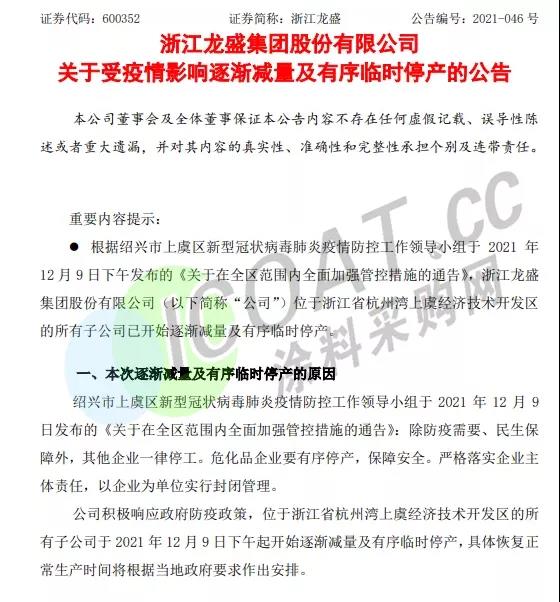 浙江龍盛:受疫情影響,公司位于浙江省杭州灣上虞經濟技術開發區的所有子公司已開始逐漸減量及有序臨時停產。上述子公司主要目前主要生產染料、化工中間體、減水劑等化工產品,預計此次臨時停產將延遲公司相關產品的生產和交付,會對公司本月經營業績產生不利影響。
