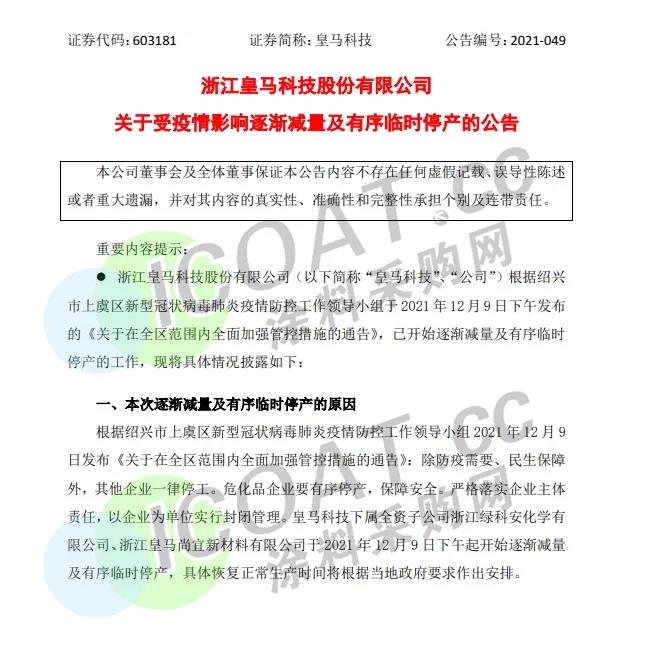 皇馬科技:公司下屬全資子公司浙江綠科安化學有限公司、浙江皇馬尚宜新材料有限公司于12月9日下午起開始逐漸減量及有序臨時停產。預計本次逐漸減量及有序臨時停產將延遲公司產品的生產和交付,預計會對公司本月經營業績產生不利影響。