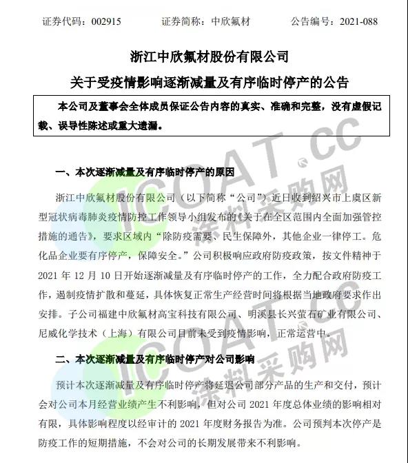 中欣氟材:于2021年12月10日開始逐漸減量及有序臨時停產,具體恢復正常生產經營時間將根據當地政府要求作出安排。