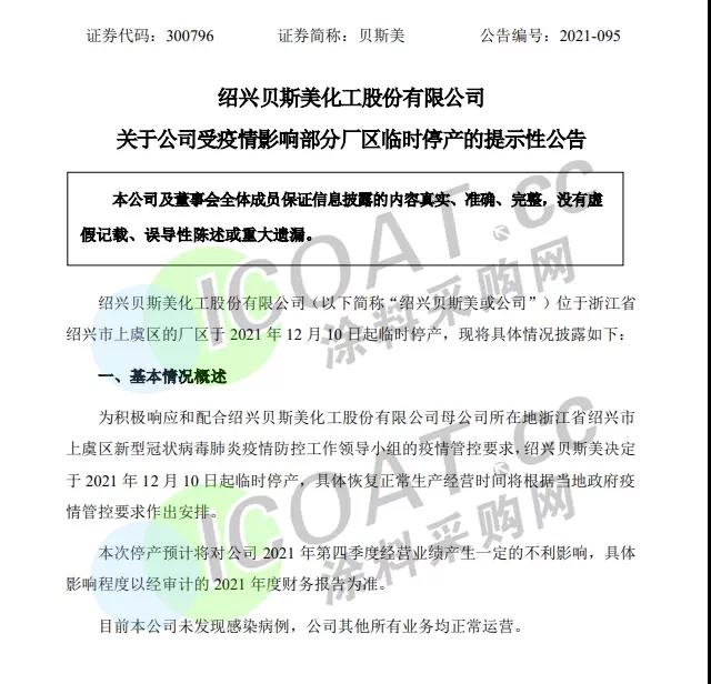 貝斯美:決定于2021年12月10日起臨時停產。本次停產預計將對公司2021年第四季度經營業績產生一定的不利影響。