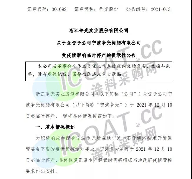 爭光股份:全資子公司寧波爭光樹脂有限公司于2021年12月10日起臨時停產,具體恢復正常生產經營時間將根據當地政府疫情管控要求作出安排。