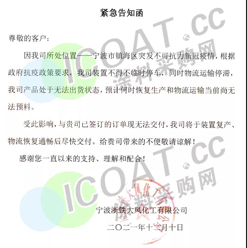 寧波浙鐵大風化工:根據要求,裝置不得不臨時停車,物流運輸停滯,產品處于無法出貨狀態,已簽訂的訂單現無法交付。