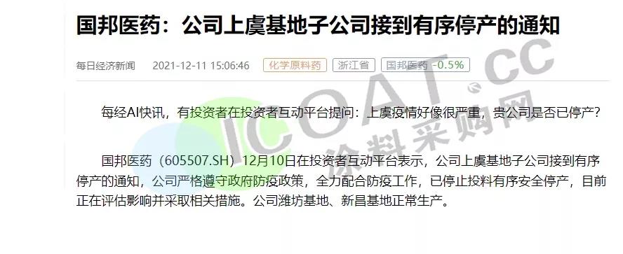 國邦醫藥:公司上虞基地子公司接到有序停產的通知,已停止投料有序安全停產,目前正在評估影響并采取相關措施。
