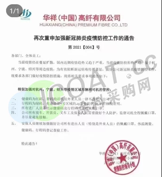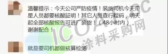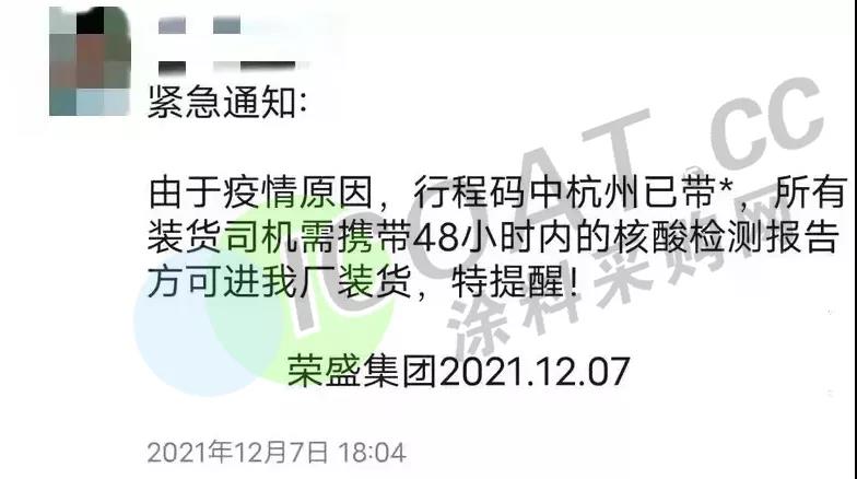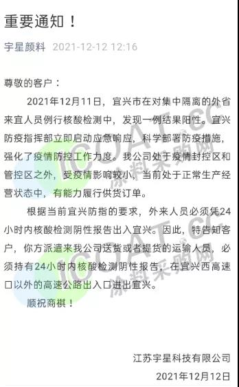 除此之外,江蘇宇星顏料、江蘇三木集團、華祥(中國)高纖有限公司、榮盛集團等當地企業均提示客戶,由于當地疫情封閉,來提貨或送貨的運輸人員,須持有24/48小時內核酸檢測陰性報告,并注意選擇特定高速口進出,健康碼為紅碼、黃碼的司機及外來人員一律不準進入。