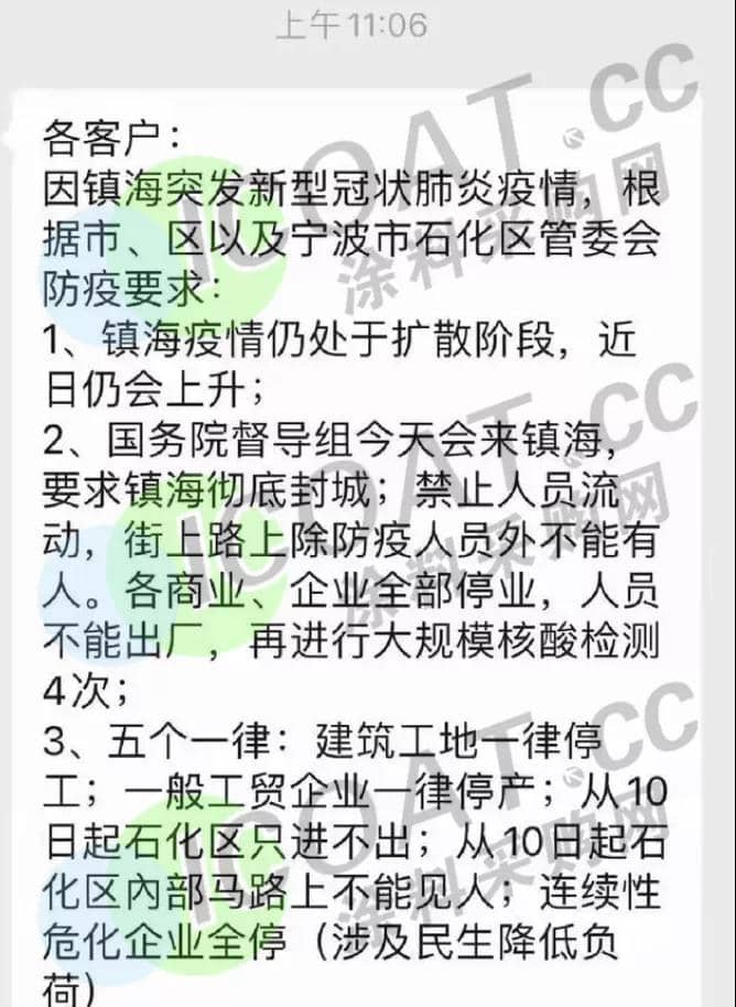 ?寧波鎮海決定在全區范圍內全面升級管控措施,除防疫需要、民生保障外,其他企業一律停工,石化連續性生產企業壓減生產負荷。嚴格落實企業主體責任,以企業為單位實行封閉管理,職工不得出廠。
