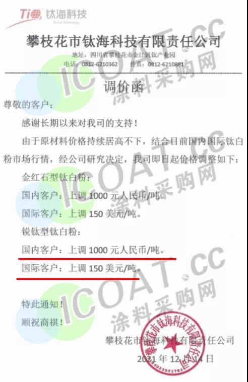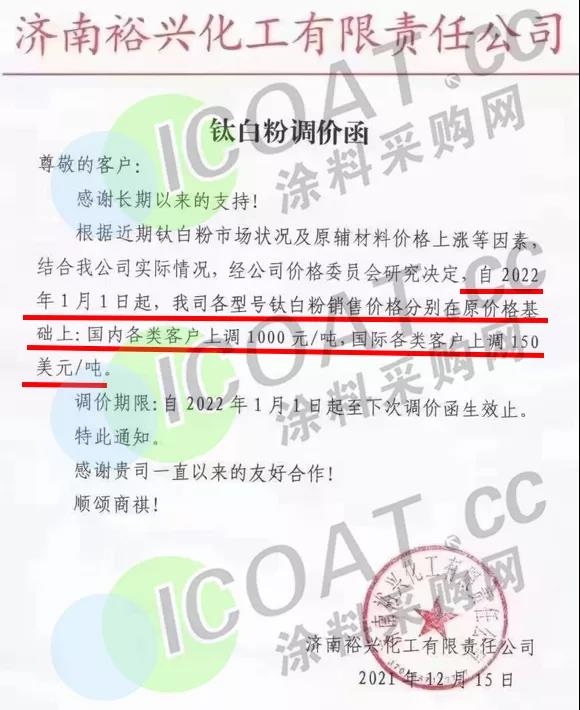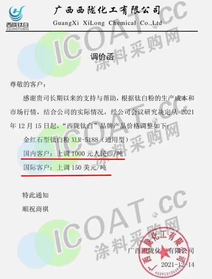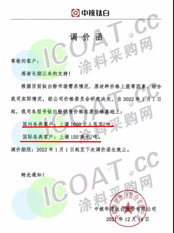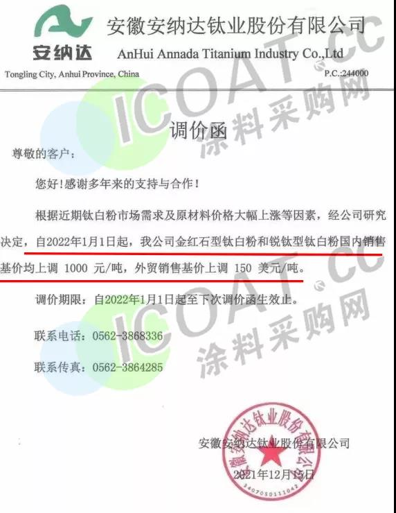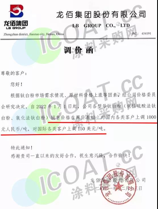 龍佰集團(tuán):自2022年1月1日起,公司各型號(hào)鈦白粉(包括硫酸法、氯化法)銷(xiāo)售價(jià)格在原價(jià)基礎(chǔ)上對(duì)國(guó)內(nèi)各類(lèi)客戶(hù)上調(diào)1000元/噸,對(duì)國(guó)際各類(lèi)客戶(hù)上調(diào)150美元/噸。