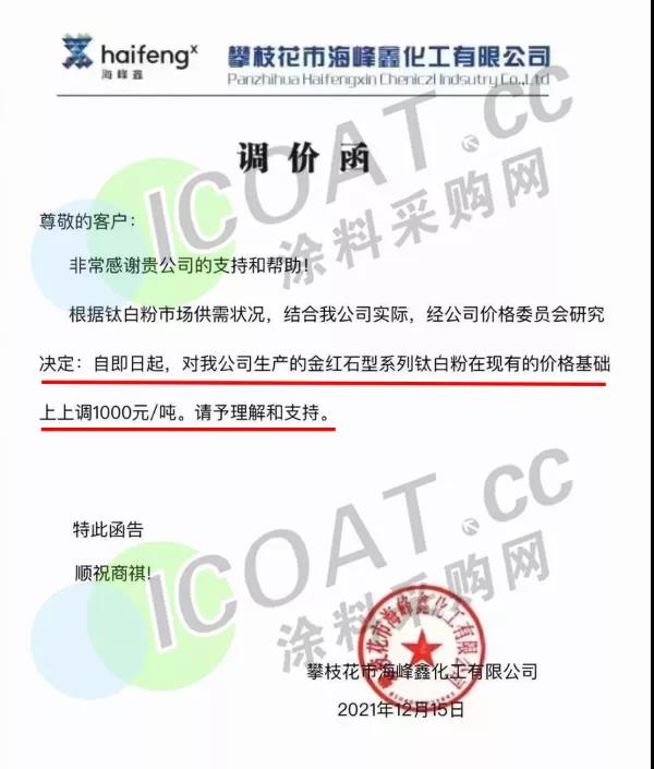 ?攀枝花市海峰鑫化工:自即日起,對(duì)金紅石型系列鈦白粉在現(xiàn)有的價(jià)格基礎(chǔ)上上調(diào)1000元/噸。