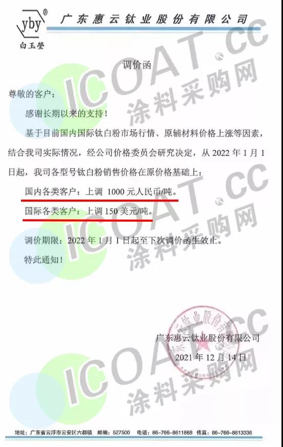 惠云鈦業(yè):從2022年1月1日起,各型號(hào)鈦白粉銷(xiāo)售價(jià)格在原價(jià)格基礎(chǔ)上: