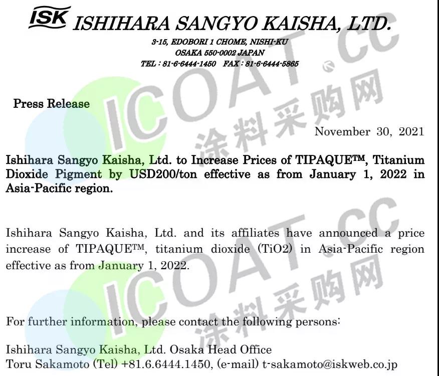 石原ISK:2022年1月1日起,上調(diào)除日本本土外所有地區(qū)鈦白粉的售價(jià)200美元/噸(約合人民幣1274元/噸)。