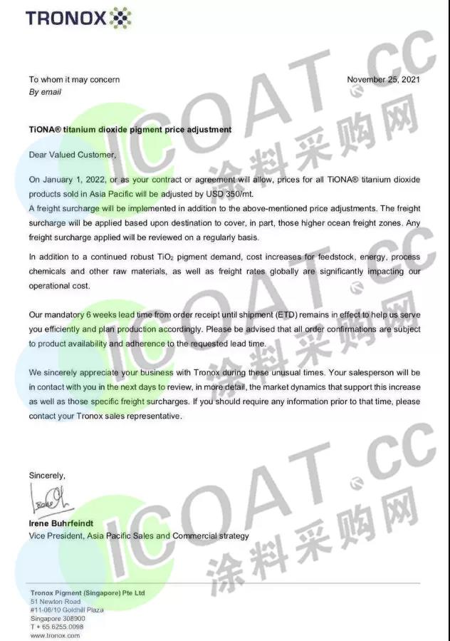 ?鈦白粉巨頭特諾(Tronox):2022年1月1日起,在亞太地區(qū)銷(xiāo)售的所有二氧化鈦產(chǎn)品的價(jià)格將上調(diào)350美元/噸(約合人民幣2237元/噸)。