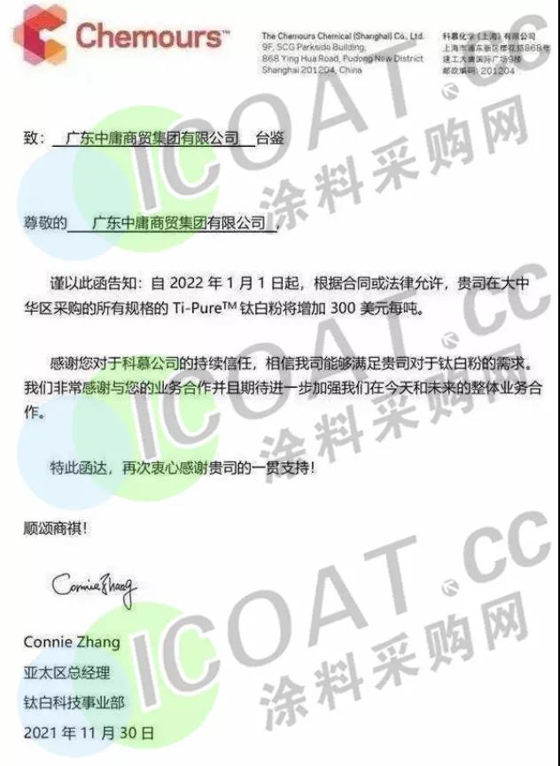 科慕(Chemours)鈦白粉:2022年1月1日起,在大中華區(qū)采購(gòu)的所有規(guī)格的Ti-PureM鈦白粉的價(jià)格將上調(diào)300美元/噸(約合人民幣1915元/噸)。