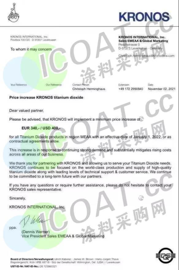 康諾斯(KRONOS):2022年2月1日起上調(diào)中東、非洲及亞洲(MEAA)地區(qū)所有型號(hào)鈦白粉的售價(jià)340歐元/噸或400美元/噸(約2200-2600元/噸區(qū)間)。